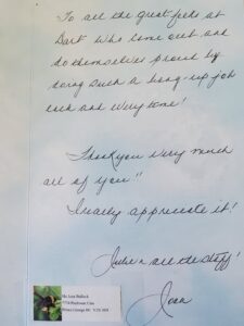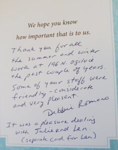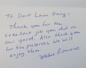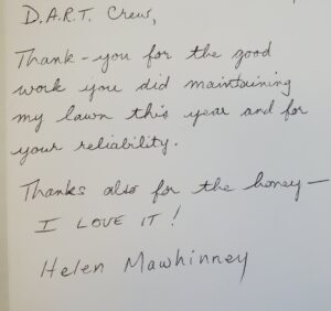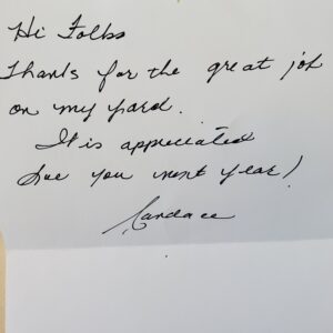 Thank you for the lawn mowing – what a joy I have had in seeing such a nice yard. This has released me from the pressure I put on myself in trying to do the logistics of getting the job done.
